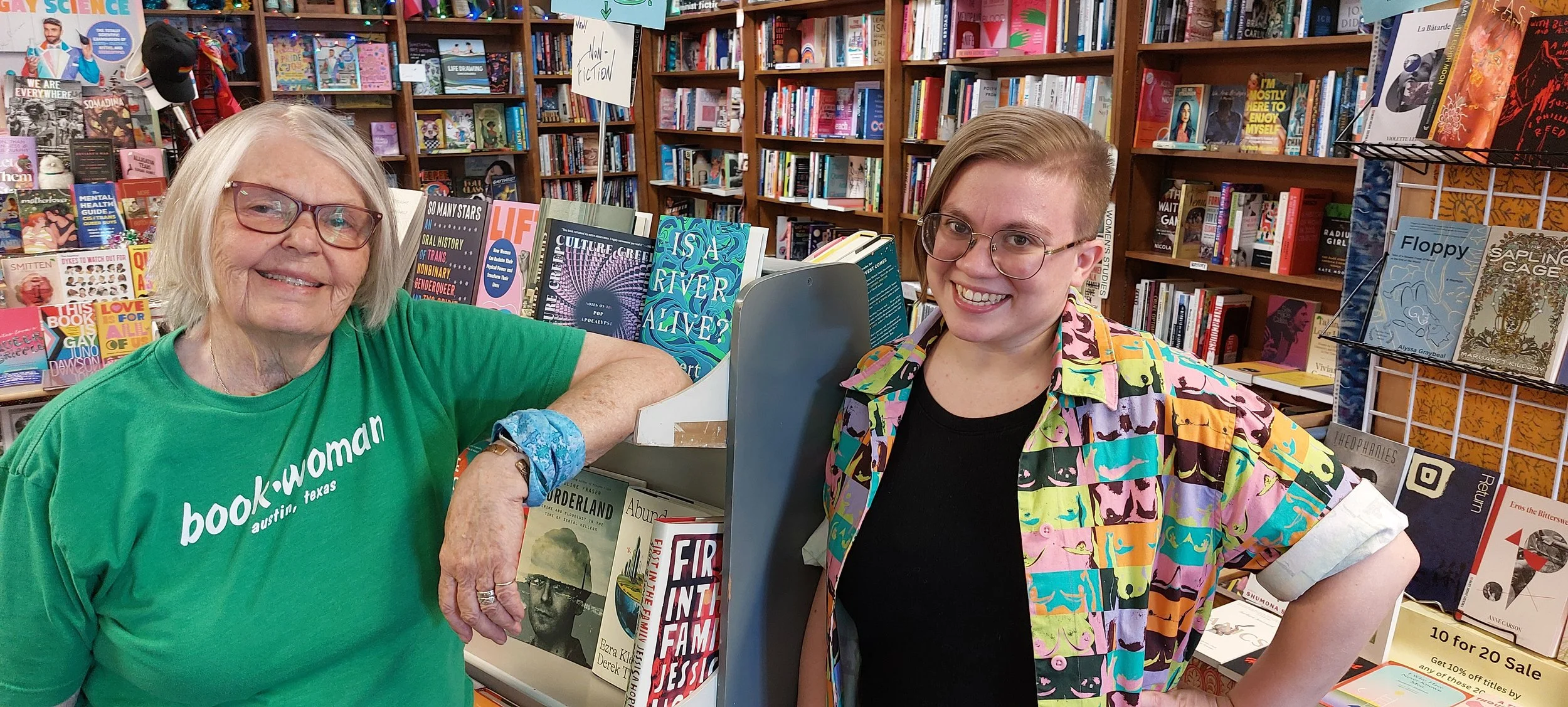 Most importantly, BookWoman has been and continues to be a community hub for many, hosting events and serving as a gathering place for folks of many experiences and identities. Countless Austinites have met friends, romantic partners, and artistic/literary collaborators in the store, and we aim to continue to bring our community together every day. Join us for a book launch, panel discussion, live music performance, open mic night, poetry reading, book club, or virtual goddess/feminine spirituality event, or pitch your own event ideas to us: we're always looking for new ways to connect with our community! And if you can't make it to the store, we might just be coming to you...BookWoman loves pop-up events and has been known to show up and show out at book fairs, conferences, community events, and more.